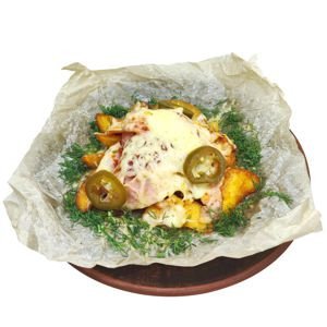 Картофельные дольки, бекон, лук-репка, соус томатный, сыр голландский, перец халапеньо