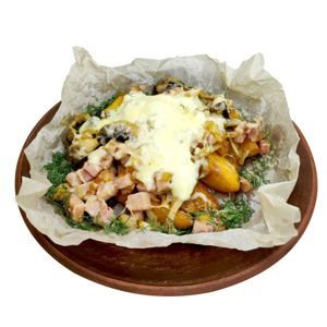 Картофельные дольки, ветчина, шампиньоны, сыр голландский, лук-репка, соус тар-тар