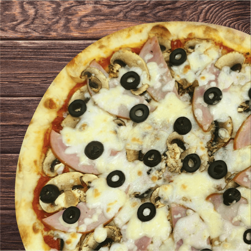 Соус Томато-Пронто, бекон, шампиньоны, маслины, сыр Моцарелла.