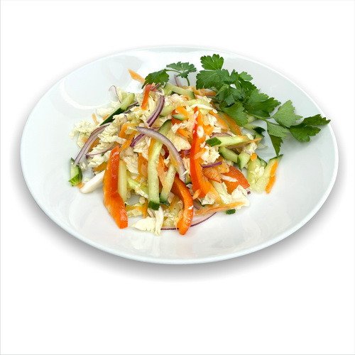 Огурец свежий, капуста Пекинская, перец болгарский, морковь свежая, лук красный, зелень, соус: масло подсолнечное, уксус бальзамический, сахар, соль